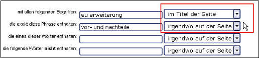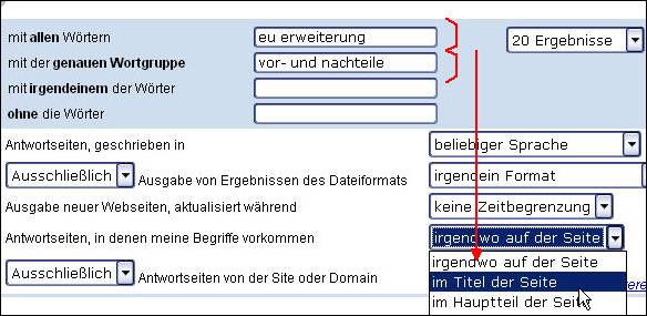Würde man das Gleiche bei Google versuchen, ließe sich hier, wie die Abbildung zeigt, nur global einstellen, wo auf der Seite gesucht wird. Würde man jedoch nach „eu UND erweiterung“ und „vor- und nachteile“ im Titel der Seite suchen, erhielte man aus nahe liegenden Gründen – weil eben „vor- und nachteile“ nicht im Titel vorkommt - keinerlei Ergebnisse. Dafür haben Sie bei Google die Option, Seiten zu suchen, die einen Link auf eine bestimmte Domain enthalten, was wiederum bei Yahoo in dieser Form nicht existiert.